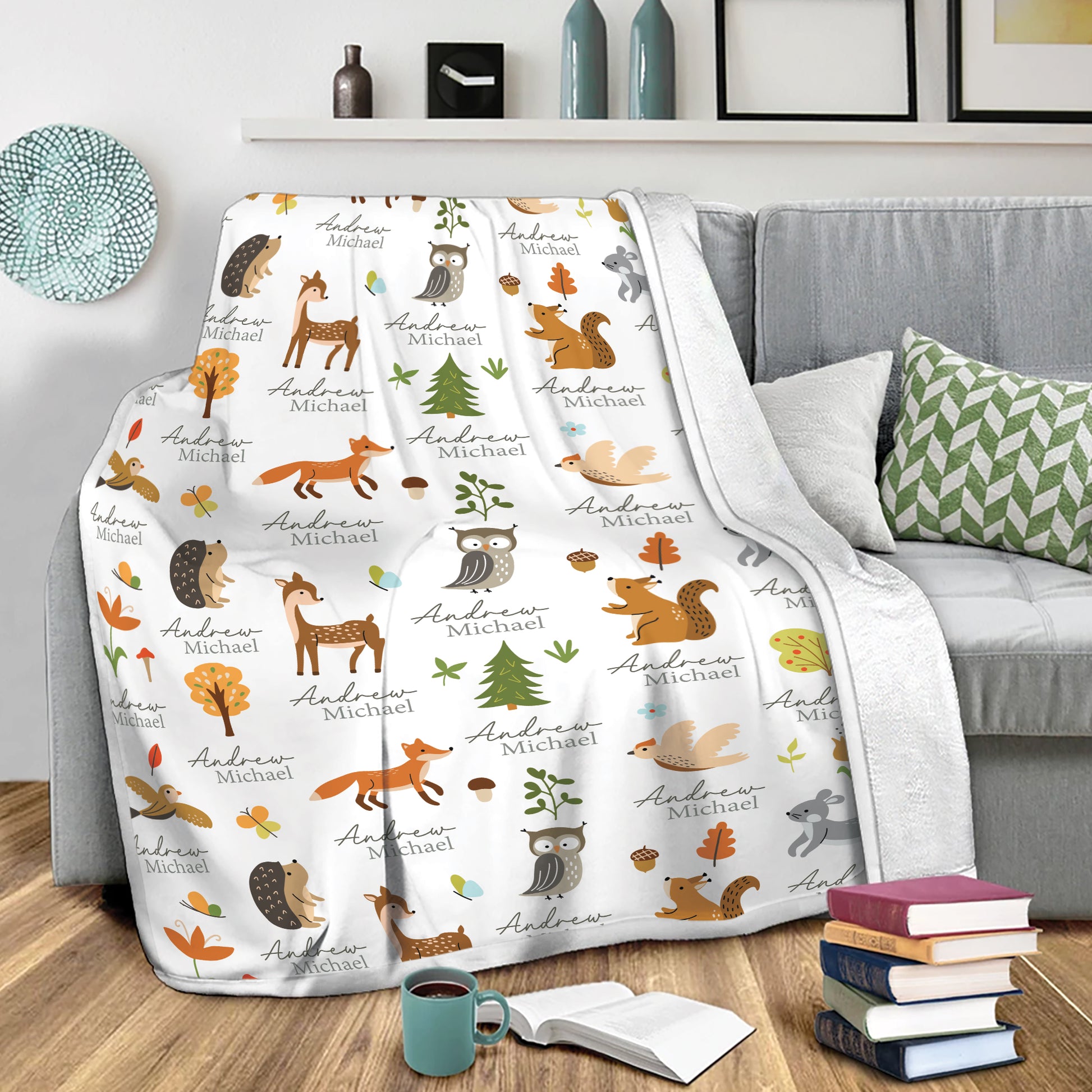 Adorable Woodland Animal Design: Featuring hedgehogs, deers, foxes, owls, bunnies, and forest trees, this woodland baby blanket fleece is filled with charm. The neutral tones fit any nursery, making it great for personalized baby blankets for boys, custom baby blankets for girls, woodland animals baby gifts, and personalized baby blankets with names.