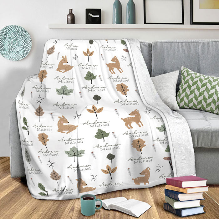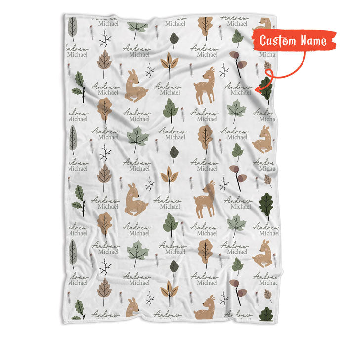 Adorable Woodland Animal Design: Featuring deers and multiple types of leaves, this woodland baby blanket fleece is filled with charm. The neutral tones fit any nursery, making it great for personalized baby blankets for boys, custom baby blankets for girls, woodland animals baby gifts, and personalized baby blankets with names.